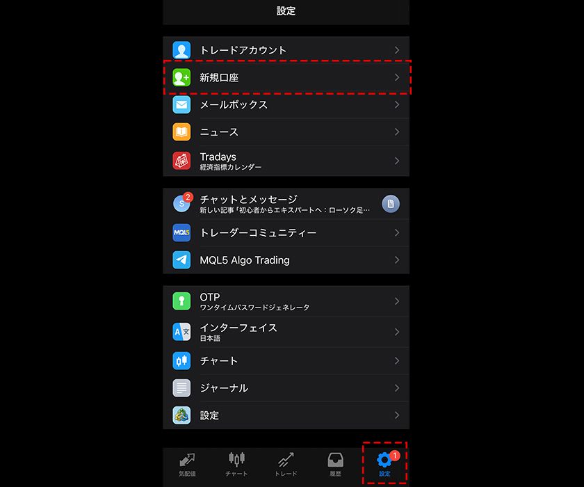 下部メニューの「設定」をタップし、メニューから「新規口座」をタップします。