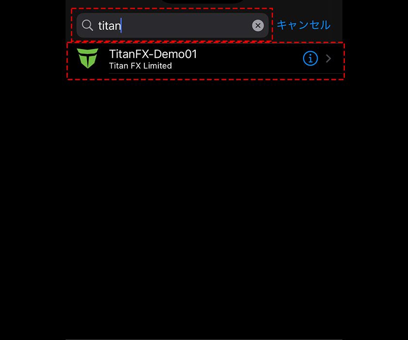 検索窓に「titan」と入力し、表示される「TitanFX-Demo01」をタップします。