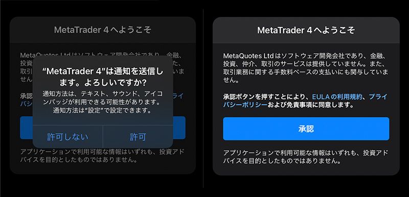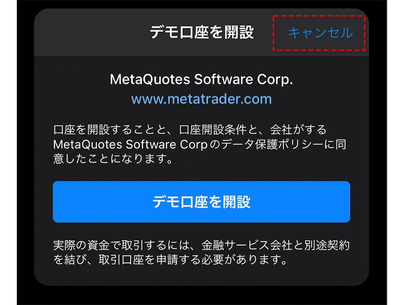 次にMetaQuatesのデモ口座開設画面が表示されますが、「キャンセル」をタップします。