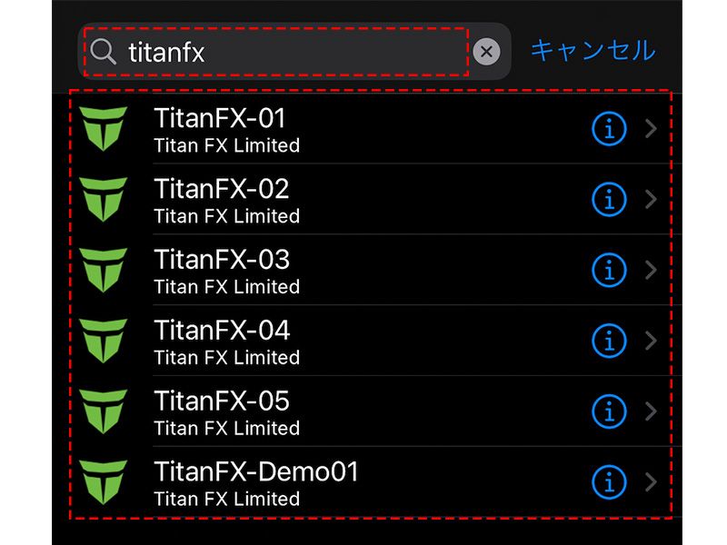 サーバを選択する画面に遷移するので、検索窓に「titanfx」と入力し、表示されるサーバの中から該当するサーバーをタップします。