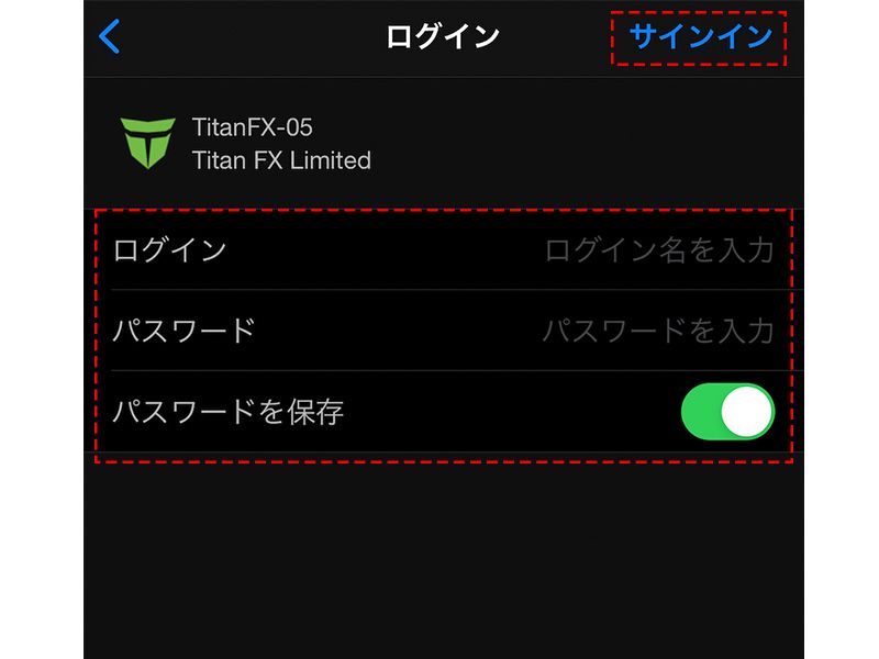 ログイン情報は、MT4用の口座を開設後にメールで送付されたものを入力します。