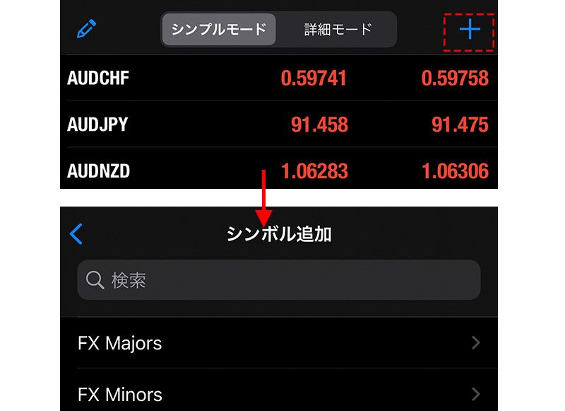 画面右上の「+」ボタンをタップし、「シンボルの追加」画面に移動し、上部の検索窓に追加したい銘柄名を入力し、表示される銘柄名の左側の「+」ボタンをタップ、または、検索窓をタップしたときに下に表示される銘柄のカテゴリをタップし、表示される銘柄から、追加したい銘柄名の左側の「+」ボタンをタップすると、銘柄を追加することができます。