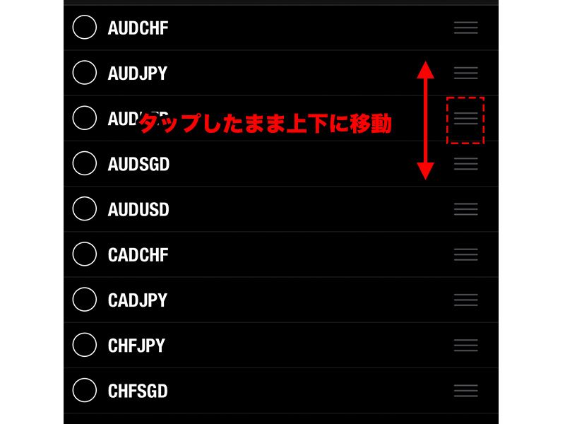 画面の左上のペンのマークのアイコンをタップし、表示される銘柄一覧内の右側のアイコンをタップしたまま上下にスライドさせると、表示の順序を変更することができます。