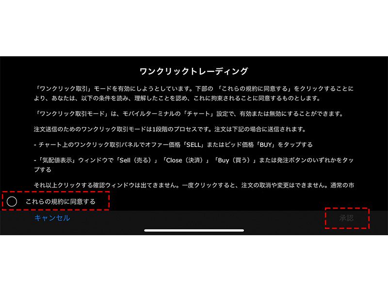 最初にワンクリックパネルをタップしたときには、ワンクリックトレーディングの規約への同意を求められます。内容を確認し、「これらの規約に同意する」にチェックを入れ、「承認」をタップすると、ワンクリック注文を発注できるようになります。