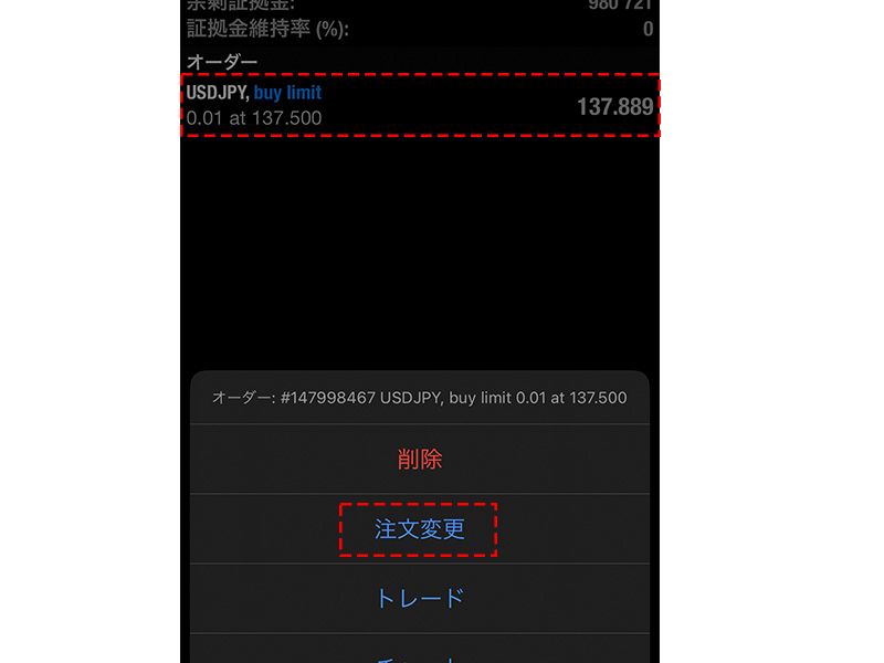 「トレード」画面内の変更したいオーダーをタップし、表示されるメニューから「注文変更」をタップします。