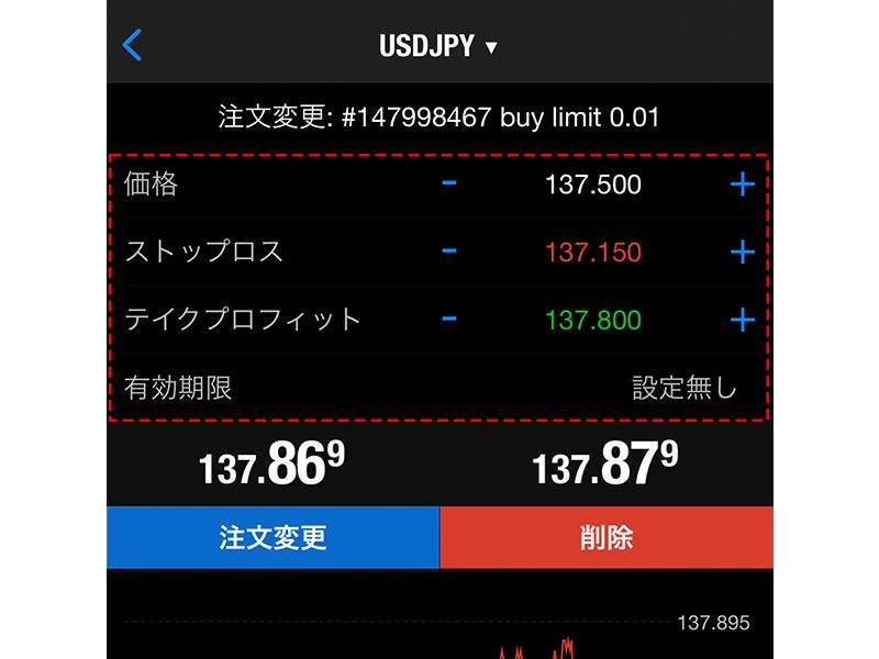 注文画面に変更内容(ストップロスやテイクプロフィットの水準)を入力し、「注文変更」をタップすると、オーダーを変更できます。