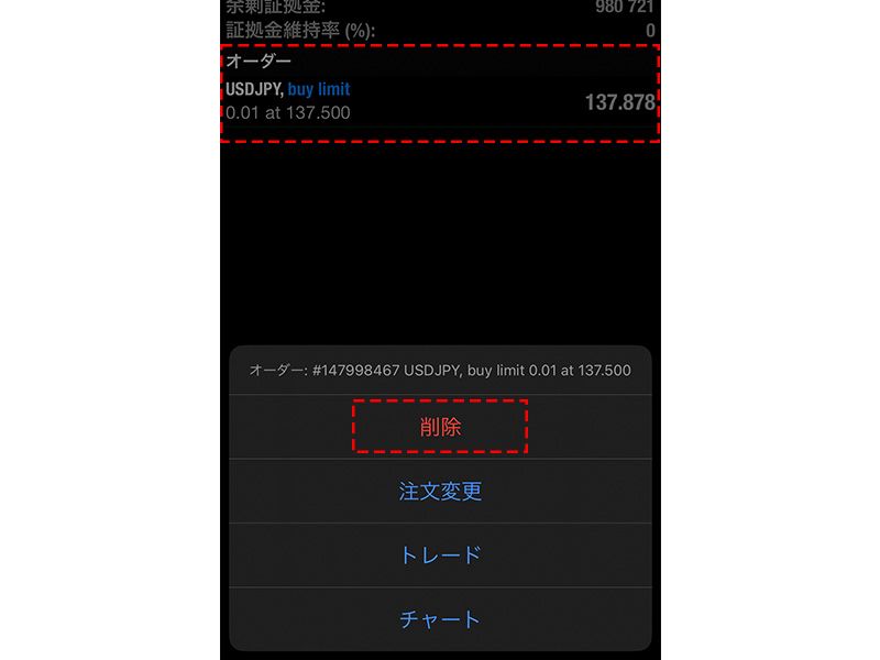 「トレード」画面内の取消したいオーダーをタップし、表示されるメニューから「削除」をタップします。確認画面が表示されるので、「削除」をタップすると、オーダーを取り消すことができます。