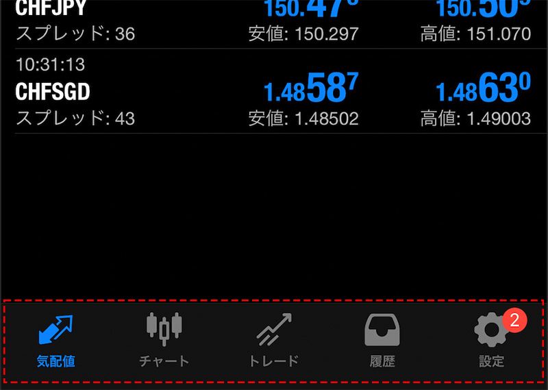 iOS版のMT4は画面下部の5つメニューで画面を切り替えて操作します。