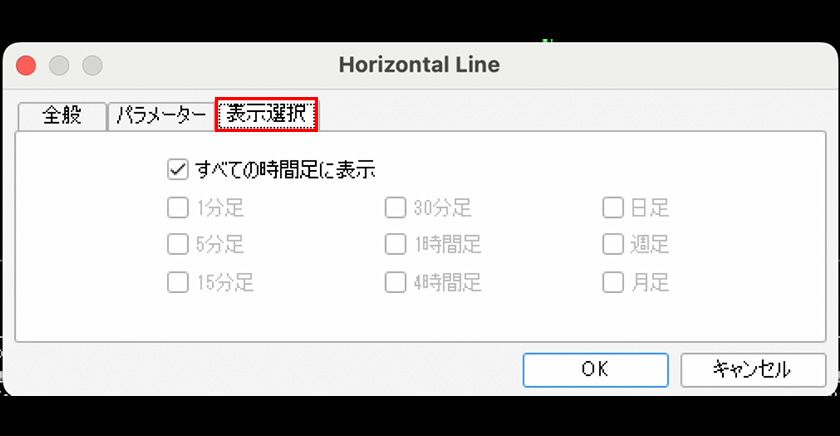 「表示選択」タブでは、水平線を表示する時間足を指定できます。「すべての時間足に表示」のチェックボックスを外すと、チェックを入れた任意の時間足のみに表示できます。
