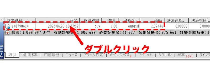 ターミナル内の「取引タブ」内の部分決済したいポジションの上でダブルクリックします。
