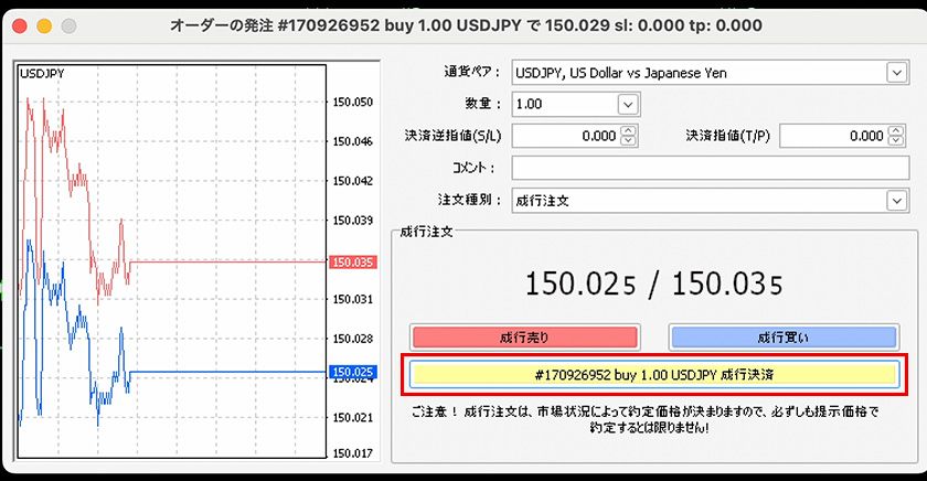 表示されるオーダーの発注ウィンドウ内の黄色い成行決済のボタンをクリックすると決済が完了します。