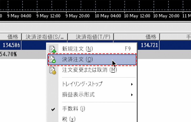 ターミナル内の「取引タブ」内の決済したいポジションの上で右クリックし、「決済注文」を選択すると、表示されます。