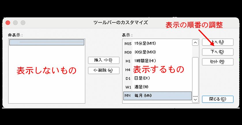 追加たい時間足を左側の時間足のグループの中からクリックし、選択した後に中央の「挿入」ボタンをクリックすると追加、表示したくない時間足を右側のグループの中からクリックし、選択した後に中央の「削除」ボタンをクリックすると削除することができます。最後に左下の「閉じる」ボタンをクリックすると、設定が完了します。