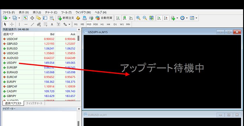 MT4でチャート画面にアップデート待機中と表示され、チャートが表示されないというときは、チャートで指定している銘柄のデータがないことを示しています。