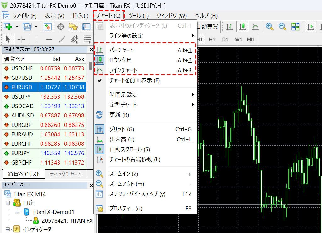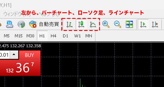 MT4のチャートではローソク足、バーチャート、ラインチャートの3種類を表示することができます。
