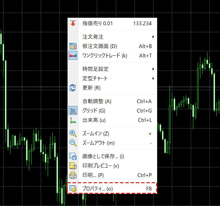 チャート上で右クリックし、表示されるメニューから「プロパティ」を選択します。
