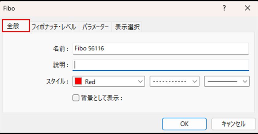プロパティ画面の4つのタブ(「全般」、「フィボナッチ・レベル」、「パラメーター」、「表示選択」)で細かいラインの設定が可能です。