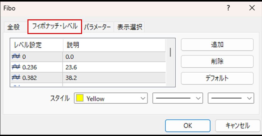 「フィボナッチ・レベル」タブでは描画する水平線の水準を指定できます。