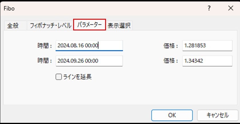 「パラメーター」タブでは基準線の始点と終点の位置を時間、価格で細かく指定することができます。