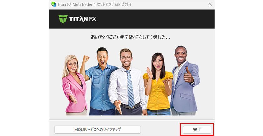 ③ インストールが完了したら、「完了」ボタンをクリックすると、TitanFXのMT4が起動します。