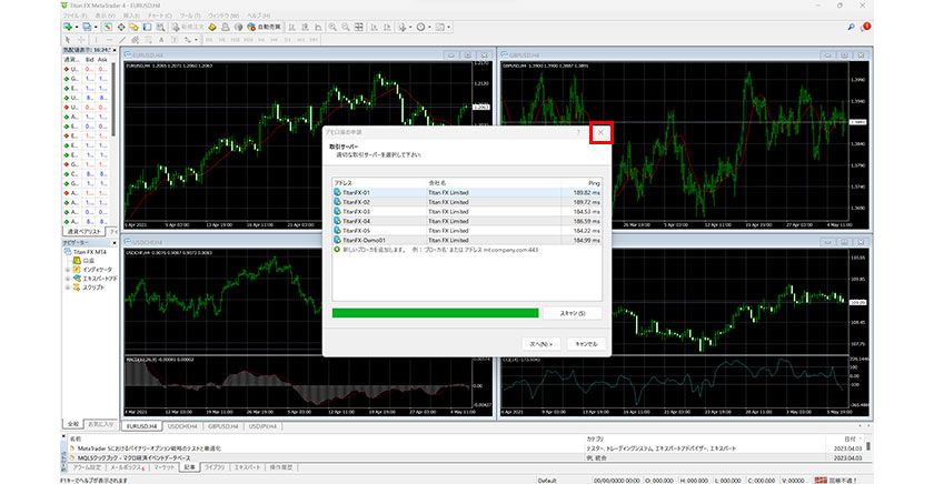 ④ インストールが完了すると、MT4が起動し、「デモ口座の申請」ダイアログが表示されますが、「×」ボタンで閉じます。