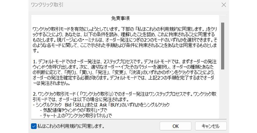③ ワンクリック注文の免責事項が表示されるので、内容を確認し、「私はこれらの利用規約に同意します。」にチェックを入れて「OK」をクリックします。