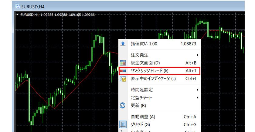 取引パネルが表示されていない場合は、チャート左上の小さな三角のアイコンをクリックするか、チャート上で右クリックし、「ワンクリックトレード」を選択すると表示することができます。