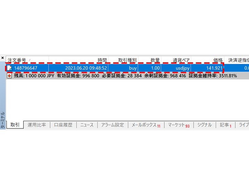 ターミナル内の「取引タブ」内の部分決済したいポジションの上でダブルクリックします。