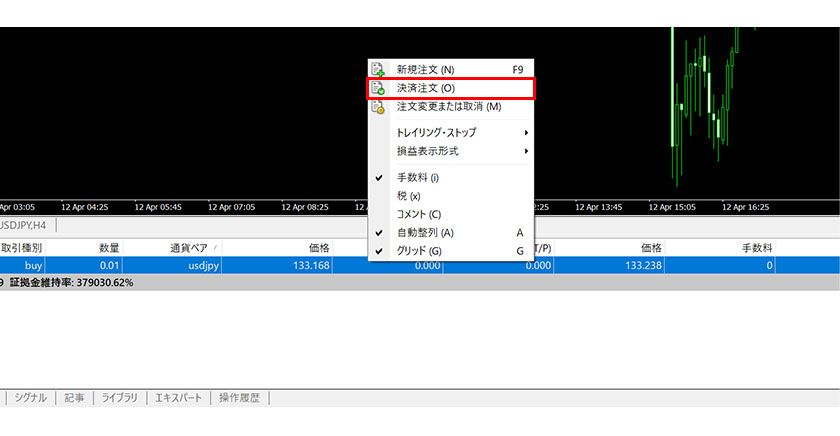 ターミナル内の「取引タブ」内の決済したいポジションの上で右クリックし、「決済注文」を選択すると、表示されます。