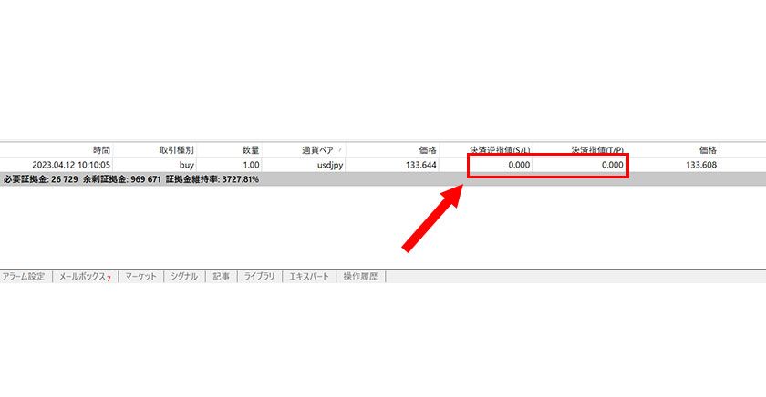 ターミナル内の「取引タブ」内の変更したいポジションの「決済逆指値」または「決済指値」の部分でダブルクリックすると表示されます。