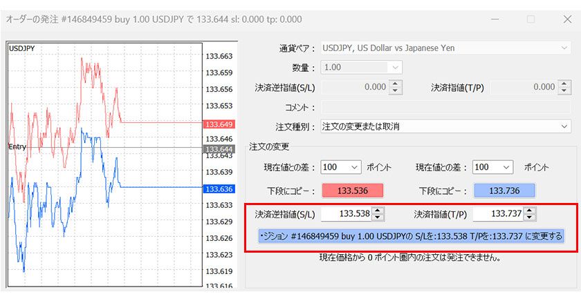 MT4では、保有中のポジションに決済の指値、逆指値注文を追加したり、すでに注文している決済注文を変更することができます。変更する方法は主に2つです。