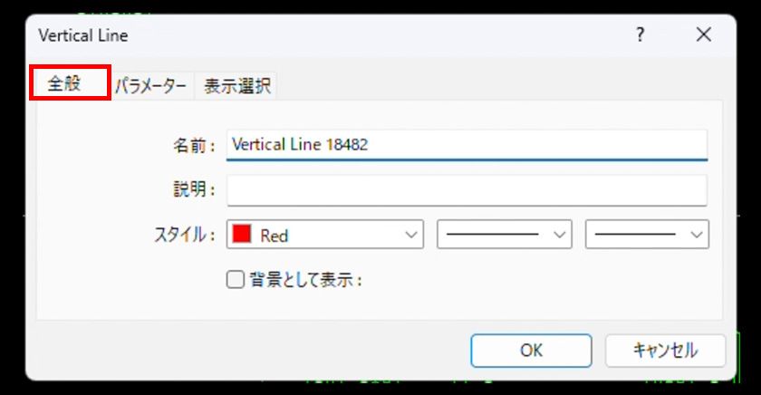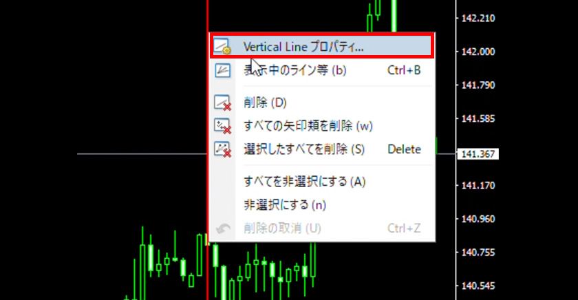 垂直線を選択した状態で右クリックし、表示されるメニューから「Vertical Lineのプロパティ」を選択すると、ラインのプロパティ画面が表示されます。