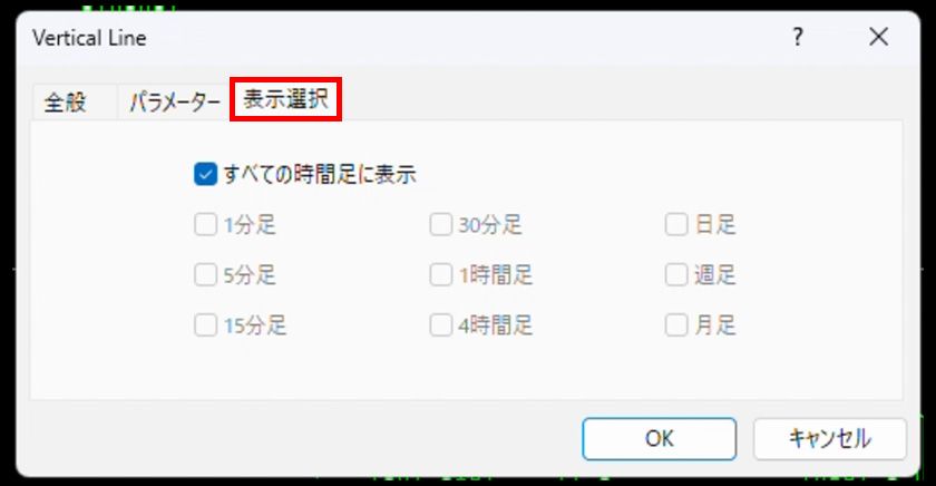 「表示選択」タブでは、垂直線を表示する時間足を指定できます。「すべての時間足に表示」のチェックボックスを外すと、チェックを入れた任意の時間足のみに表示できます。
