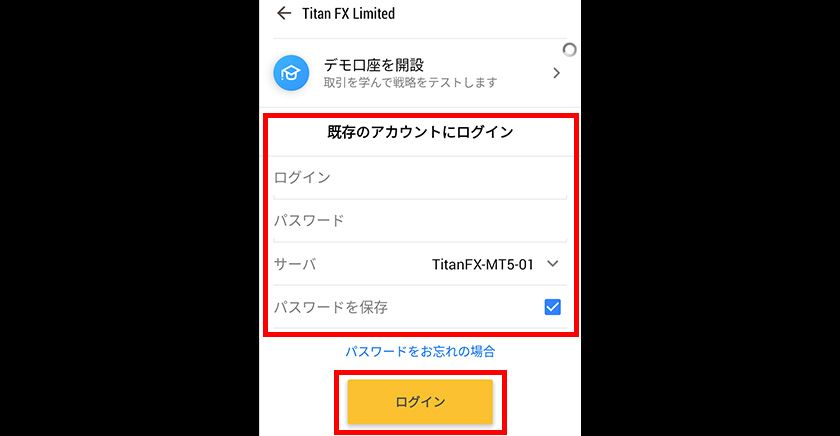 続いて、「既存のアカウントにログイン」の下に追加したい口座の「ログイン(ログインID)」、「パスワード」を入力し、該当するサーバを選択します。「パスワードを保存」にチェックを入れた状態で「ログイン」をタップすると、ログインし、口座情報が登録されます。