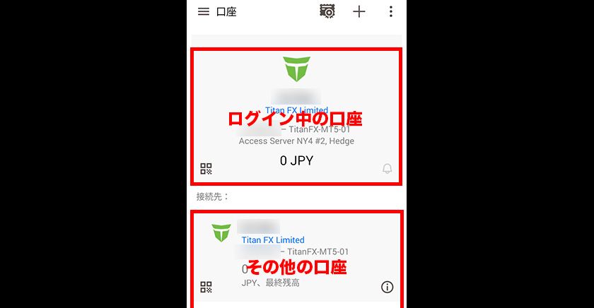 上段に現在ログインしている口座情報が表示され、下段にその他の登録されている口座が表示されます。この中から、ログインしたい口座をタップすると、ログインするアカウントを切り替えることができます。