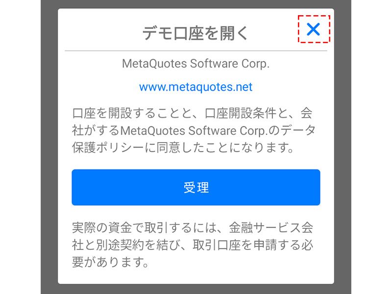 次にMetaQuatesのデモ口座開設画面が表示されますが、「取消」をタップします。