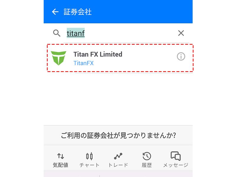 証券会社を検索する画面に遷移するので、検索窓に「titanfx」と入力し、表示されるサーバの中から「Titan FX LImited」をタップします。