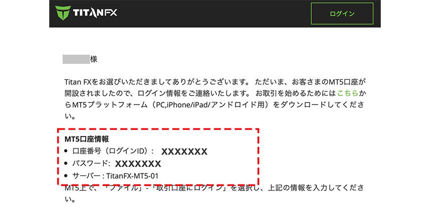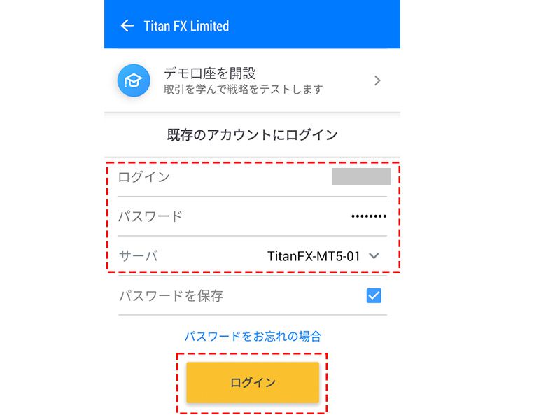 ログイン情報は、MT5用の口座を開設後にメールで送付されたものを入力します。