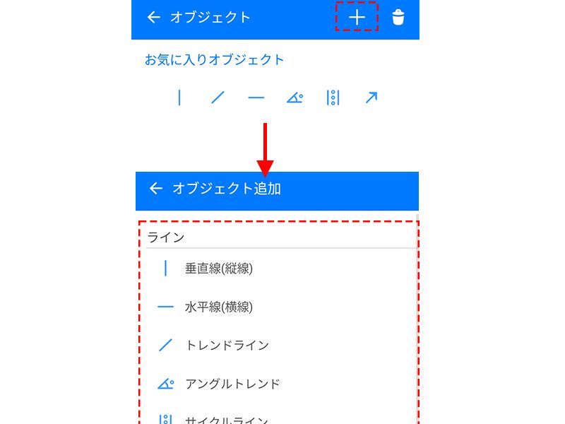 ライン等のオブジェクトの描画は、チャートをタップすると表示されるメニューから、オブジェクトのアイコンをタップして行います。