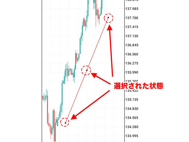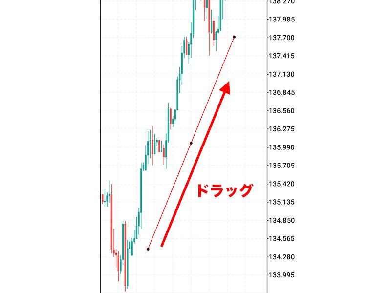水平線や垂直線の場合は描画したい水準でタップ、トレンドライン等の場合は、チャート上のオブジェクトの始点となる部分でタップし、終点までドラッグさせると描画することができます。