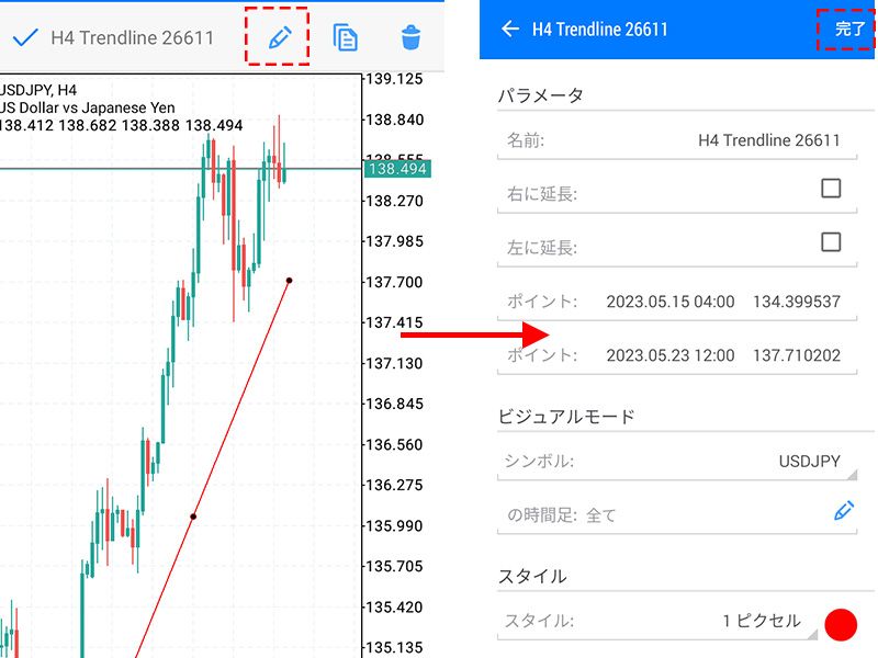 設定画面に遷移するので、左右の延長や表示位置の細かい指定、表示するチャートの指定、色やスタイル等を指定し、右上の「完了」をタップすると設定できます。