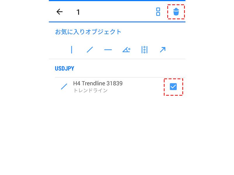 チャート上でタップし、表示されるメニューからのオブジェクトのアイコンをタップすると、表示しているオブジェクトリストが表示されます。