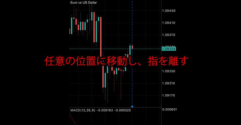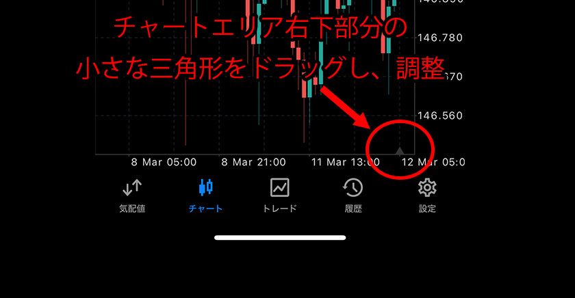 メインチャートエリア右下の小さな三角形の部分に指を当て、ドラッグします。