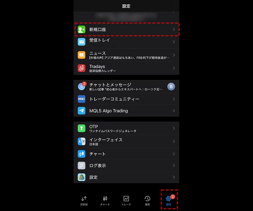 下部メニューの「設定」をタップし、メニューから「新規口座」をタップします。