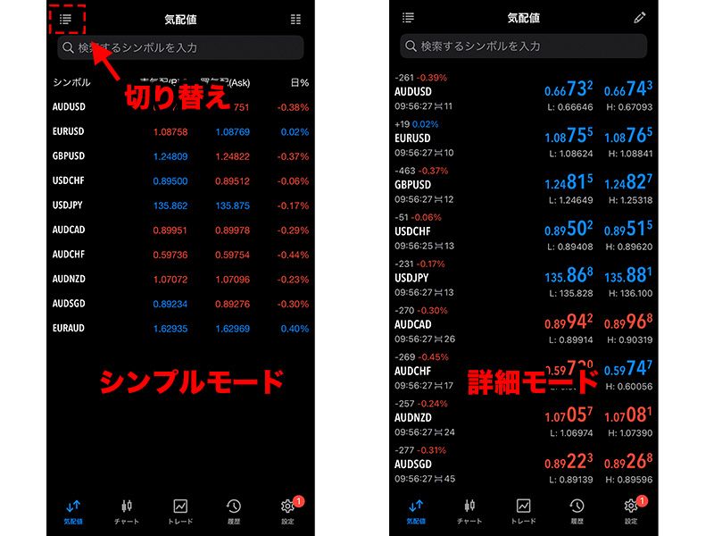 iOS版のMT5の気配値表示画面では、売値・買値・変化率を中心にシンプルな表示のシンプルモードと変化率、最終更新時間、スプレッド、高値、安値等を表示することができる詳細モードの2種類のモードですることができます。