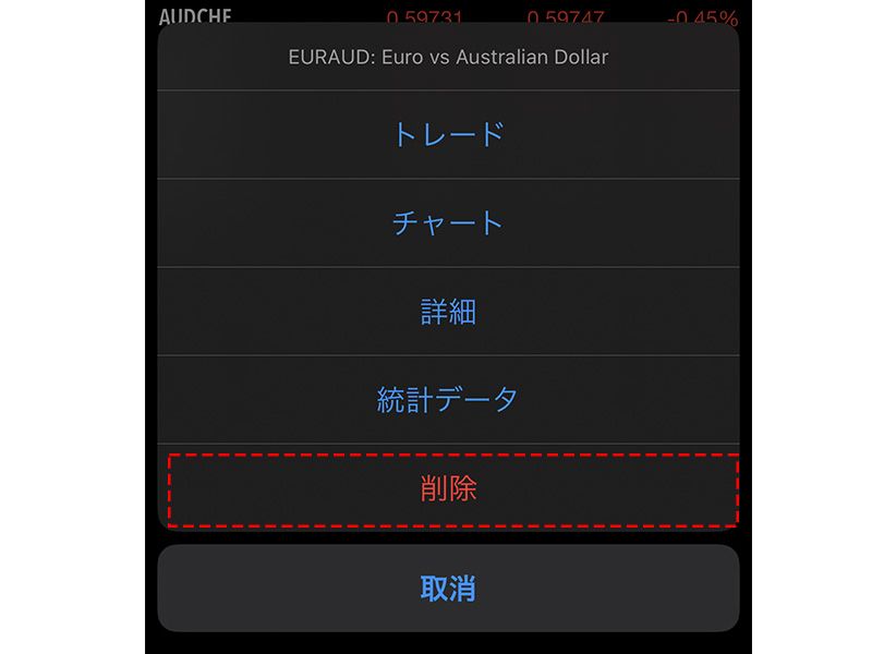 削除したい銘柄名をタップし、表示されるメニューから、「削除」をタップすると、気配値表示から削除することができます。