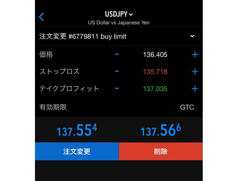 また、「SL」、「TP」をタップし、オーダーに付随する指値、逆指値注文の水準を指定することもできます。