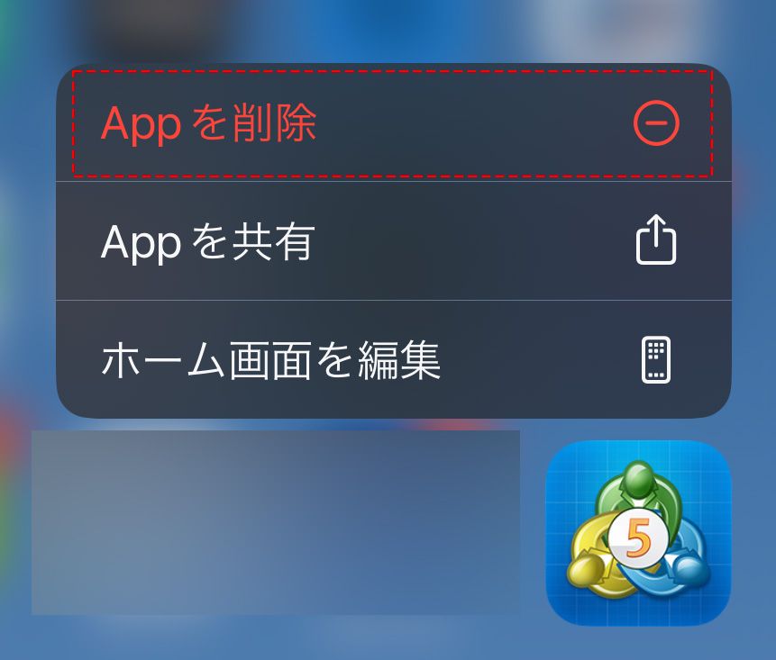 MetaTrader5のアイコンを長押しし、表示されるメニューからAppを削除を選択すると、アプリをアンインストールすることができます。