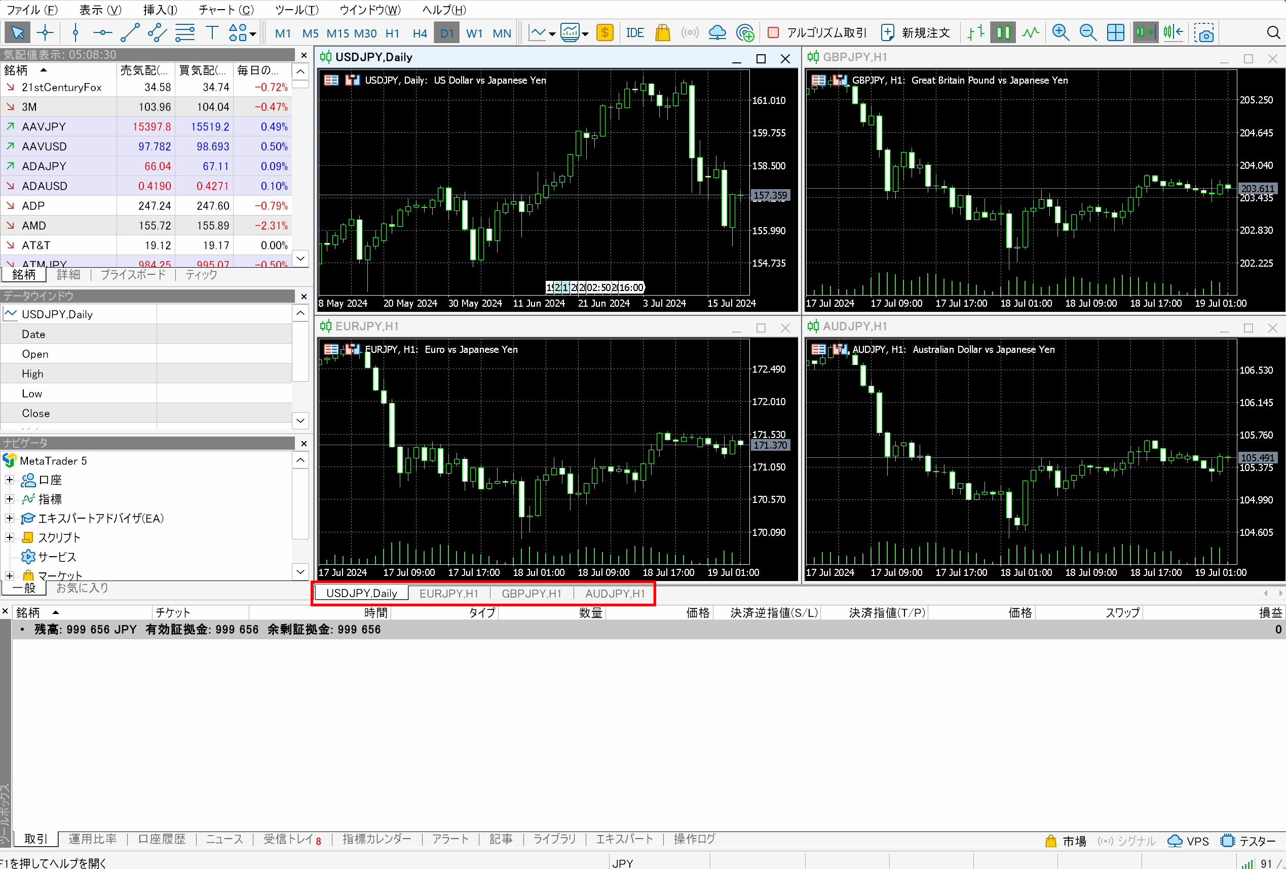 MT5はデフォルトでチャートエリアの下部にチャートバーが表示されます。このチャートバーでは、チャートの選択の切り替えや表示の切り替えができます。