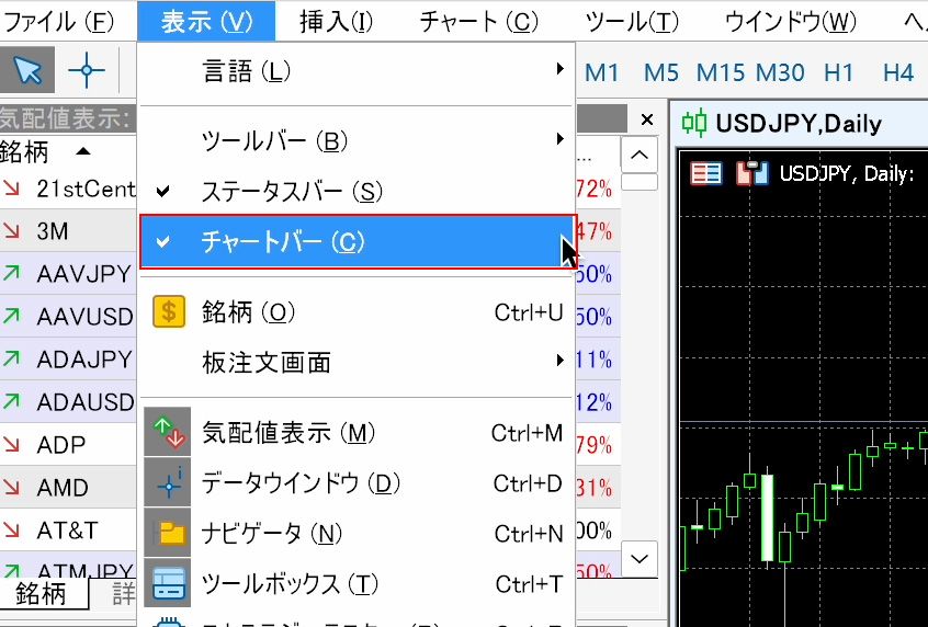 メニューの「表示」から「チャートバー」を選択すると、チャートバーの表示/非表示を切り替えることができます。表示中は「チェックボックス」の文字の左側にチェックが入っています。